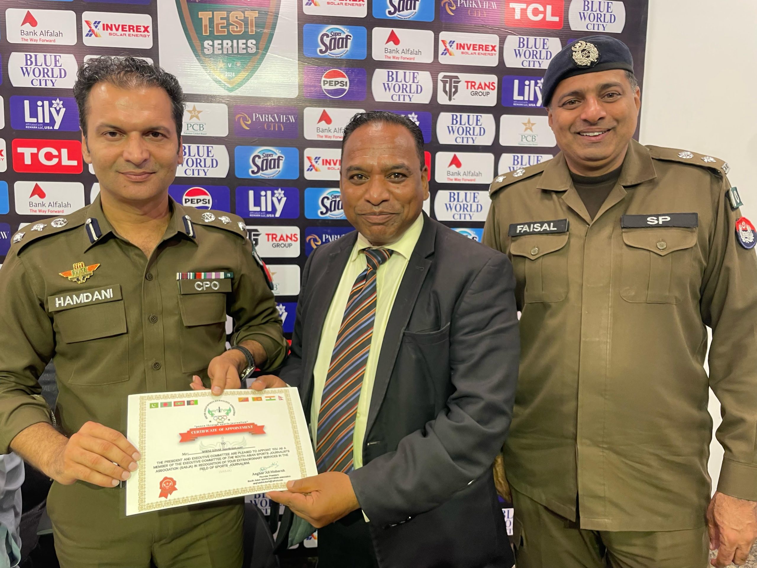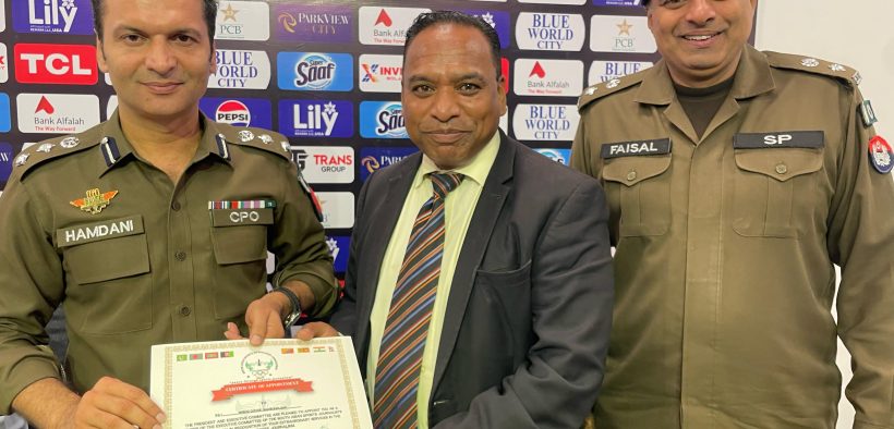 بانی صدر ساؤتھ ایشین سپورٹس جرنلسٹس ایسوسی ایشن اصغر علی مبارک سی پی او راولپنڈی سید خالد ہمدانی کوپاکستان میں انٹرنیشنل کرکٹ کی بحالی ، کرکٹ سیکورٹی انتظامات پر سرٹیفکیٹ دے رہےہیں۔