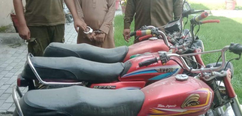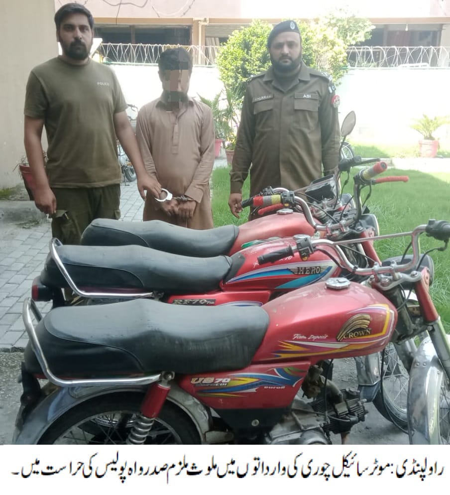 راولپنڈی( )ایس ایچ او تھانہ صدرواہ محسن شاہ کی زیرنگرانی پولیس ٹیم کی کاروائی، موٹر سائیکل چوری کی وارداتوں میں ملوث ملزم گرفتار،چوری شدہ 03 موٹر سائیکل برآمد۔تفصیلات کے مطابق صدر واہ پولیس نے کاروائی کرتے ہوئے موٹرسائیکل چوری کی وارداتوں میں ملوث ملزم عاصم کو گرفتار کرلیا، ملزم سے چوری شدہ 03 موٹرسائیکل برآمد ہوئے، ملزم کے ساتھیوں سہولت کاروں کی گرفتاری کا تحرک جاری ہے،ایس پی پوٹھوہار ناصر نواز کا کہنا تھاکہ شہریوں کو ان کے قیمتی اثاثے سے محروم کرنے والے ملزمان کے خلاف کاروائیاں جاری رکھی جائیں گی۔