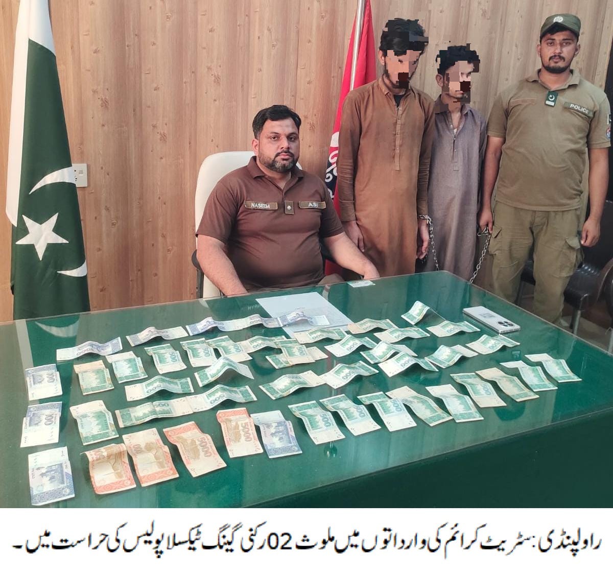 راولپنڈی( )ایس ایچ او تھانہ ٹیکسلا رانا کاشف کی زیرنگرانی پولیس ٹیم کی کاروائی، سٹریٹ کرائم کی وارداتوں میں ملوث 02 رکنی گینگ گرفتار،چھینا گیا موٹر سائیکل، نقدی 45 ہزار اور موبائل فون برآمد۔تفصیلات کے مطابق ٹیکسلا پولیس نے کاروائی کرتے ہوئے سٹریٹ کرائم کی وارداتوں میں ملوث 02 رکنی گینگ کوگرفتار کرلیا،گرفتار ملزمان میں بہادر اور سراج شامل ہیں، ملزمان سے چھینا گیا موٹر سائیکل، نقدی 45 ہزار اور موبائل فون برآمد ہوا، ایس پی پوٹھوہار ناصر نواز نے ایس ایچ او ٹیکسلا اور ٹیم کو شاباش دیتے ہوئے کہا کہ منظم و متحرک گینگز کے خلاف کارروائیاں جاری رکھی جائیں گی۔v