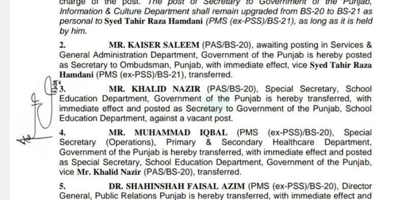 سید طاہر رضا ہمدانی سیکرٹری اطلاعات ،غلام صغیر شاہد ڈی جی پی آر تعینات، متعدد بیوروکریٹ تبدیل