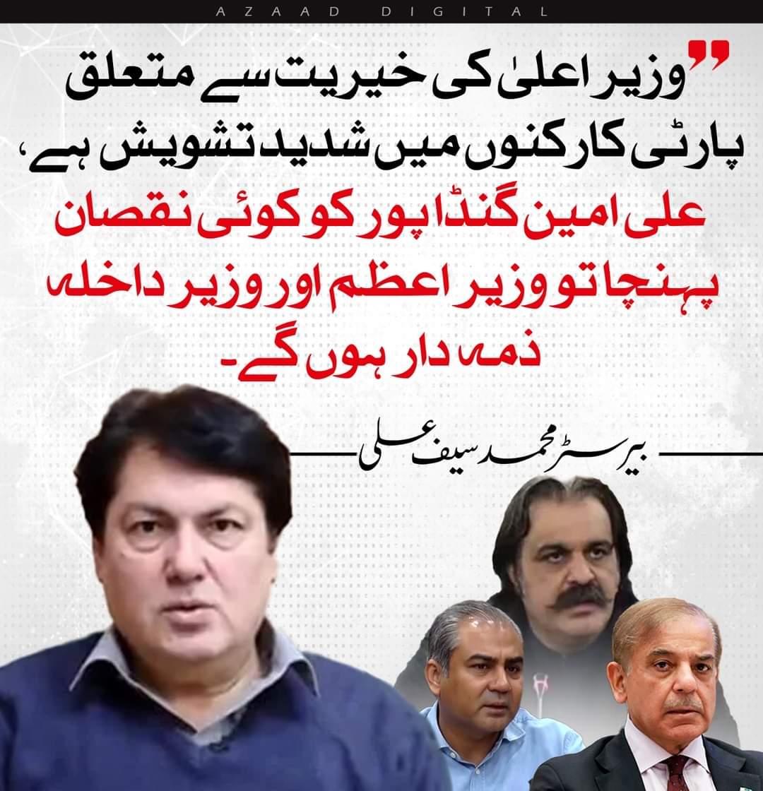 پاکستان تازہ ترین اسلام آباد(اردو ٹائمز) وزیر اعلیٰ کی خیریت سے متعلق پارٹی کارکنوں میں شدید تشویش ہے admin 2024-10-07 Share وزیر اعلیٰ کی خیریت سے متعلق پارٹی کارکنوں میں شدید تشویش ہے،علی امین گنڈا پور کو کوئی نقصان پہنچا تو وزیر اعظم اور وزیر داخلہ ذمہ دار ہوں گے۔ بیرسٹر محمد سیف علی