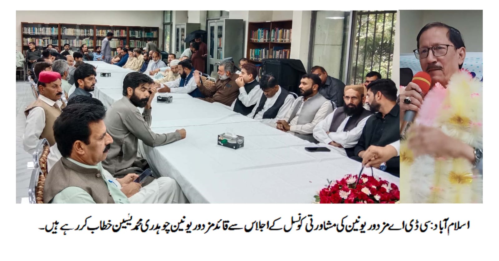 سی ڈی اے مزدور یونین کی مشاورتی کونسل کے اجلاس سے قائدین مزدور یونین کا خطاب۔