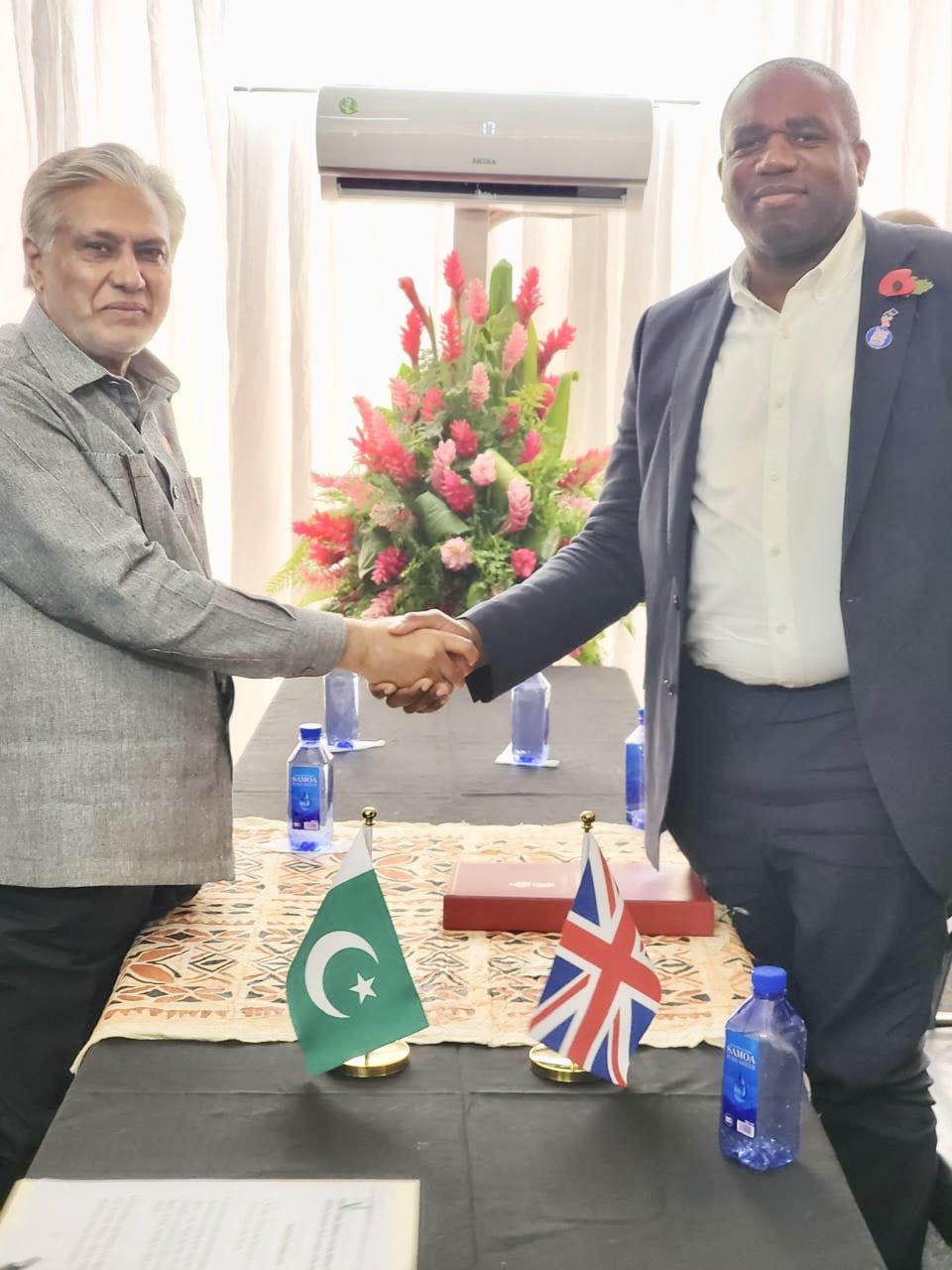 Deputy Prime Minister and Foreign Minister Mohammad Ishaq Dar had a productive meeting with UK Foreign Secretary David Lammy on the sidelines of #CHOGM2024 in Apia, #Samoa. They discussed wide range of topics including strengthening Pakistan-UK relations across multiple areas of mutual interest. Deputy Prime Minister Dar extended a warm invitation to UK Foreign Secretary to visit Pakistan. They agreed to work together for deepening Pakistan-UK partnership and taking it to next higher level.