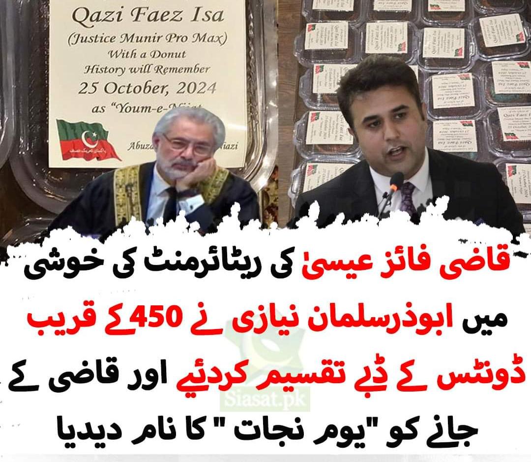 پاکستان اسلام آباد (اردو ٹائمز) قاضی فائز عیسیٰ کی ریٹائرمنٹ کی خوشی میں ابوذرسلمان نیازی نے 450 کے قریب ڈونٹس کے ڈبے تقسیم کردئیے اور قاضی کے جانے کو “یوم نجات ” کا نام دیدیا Urdu Times 2024-10-28 Share