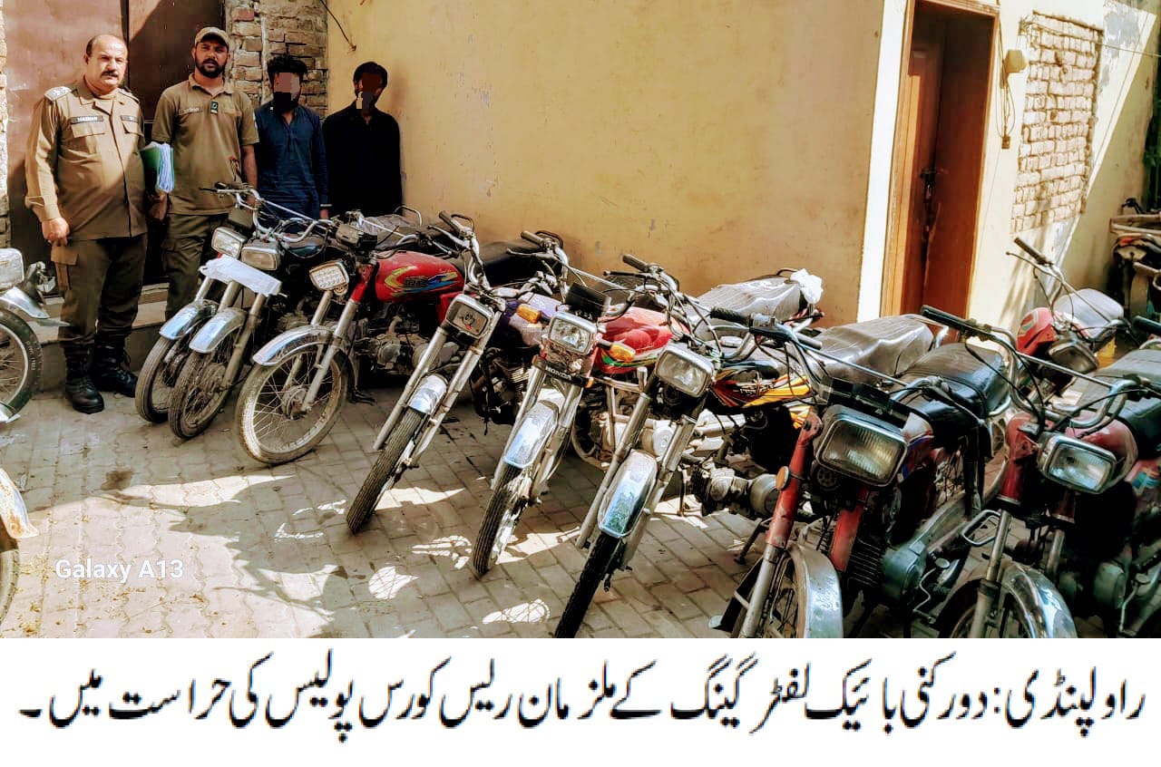 راولپنڈی ایس ایچ او تھانہ ریس کورس زوہیب شاہ کی زیرنگرانی پولیس ٹیم کی کاروائی، دو رکنی بائیک لفٹرگینگ گرفتار،لاکھوں روپے مالیت کے مسروقہ 14 موٹر سائیکل برآمد۔ تفصیلات کے مطابق ریس کورس پولیس نے کاروائی کرتے ہوئے دو رکنی بائیک لفٹر گینگ کو گرفتارکر لیا،گرفتار ملزمان میں سرغنہ فہد اور عدنان شامل ہیں، ملزمان سے لاکھوں روپے مالیت کے مسروقہ 14 موٹر سائیکل برآمدہوئے،ایس پی پوٹھوہار ناصر نواز نے ایس ایچ او ریس کورس اور ٹیم کو شاباش دیتے ہوئے کہا کہ گاڑی و موٹر سائیکل چوری میں ملوث ملزمان قانون کی گرفت سے بچ نہیں سکتے۔