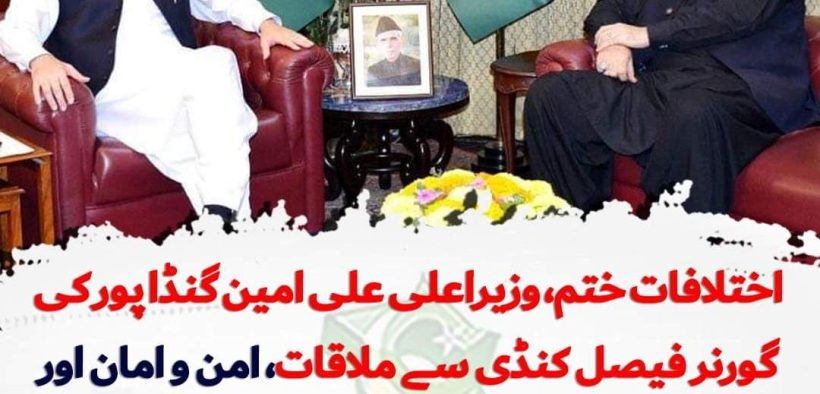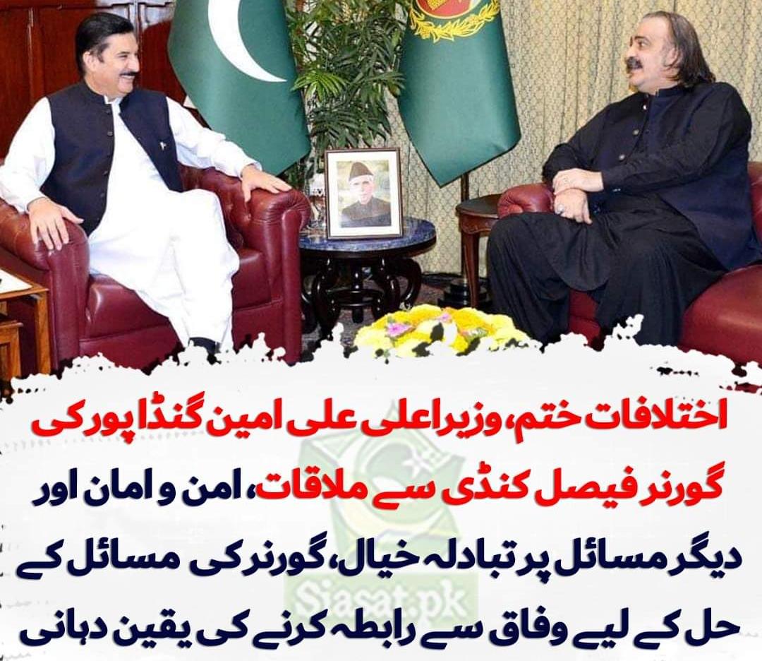 پاکستان اسلام آباد (اردو ٹائمز) اختلافات ختم، وزیراعلی علی امین گنڈا پور کی گورنر فیصل کنڈی سے ملاقات Urdu Times 2024-11-08 Share اختلافات ختم، وزیراعلی علی امین گنڈا پور کی گورنر فیصل کنڈی سے ملاقات، صوبے میں امن و امان اور دیگر مسائل پر تبادلہ خیال، گورنر کی صوبائی مسائل کے حل کے لیے وہ وفاق سے رابطہ کرنے کی یقین دہانی