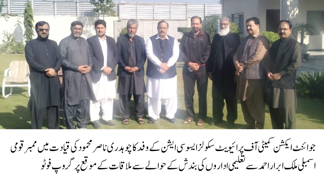 جوائنٹ ایکشن کمیٹی آف پرائیویٹ سکولز اینڈ کالجز ایسوسی ایشنز نے تعلیمی اداروں کی بندش کے حوالے سے چوہدری ناصر محمود کی قیادت میں ممبر قومی اسمبلی ملک ابرار احمد سے ملاقات کی ۔ ملاقات میں پاکستان چیمبر آف ایجوکیشن ، ایپسما، آئی ایف سی ، پرائیویٹ سکولز اینڈ مینجمنٹ ایسوسی ایشن ، پرائیویٹ ایجوکیشنل سوسائٹی ، راولپنڈی ایسوسی ایشن آف پرائیویٹ سکولز کے نمائندوں نے شرکت کی اور حکومت پنجاب کی طرف سے راولپنڈی ڈویژن کے نجی و سرکاری تعلیمی اداروں کو سموگ کے باعث مزید ایک ہفتہ تک بند کرنے پر گہری تشویش کا اظہار کیا اور ملک ابرار احمد کو اپنا کردار ادا کرنے کا مطالبہ کیا۔ ملک ابرار احمد نے وفد کو یقین دلایا کہ وہ نجی تعلیمی اداروں کے مسائل کے حل کےلیے ہر ممکن کوشش کریں گے ۔ اس بابت ممبران صوبائی اسمبلی پنجاب کو بھی کہوں گا کہ پنجاب اسمبلی کے فلور پر اس مسلہ کو اٹھائیں کہ سموگ وغیرہ کے تدارک کے لیے پالیسی بناتے وقت راولپنڈی ڈویژن کے مخصوص حالات کو مدنظر رکھا جائے ۔ انھوں نے کہا کہ میں نے ہمیشہ بچوں کی تعلیم کے لیے اپنا کردار ادا کیا ہے اور کرتا رہوں گا۔ ملک اظہر سیکرٹری جنرل جوائنٹ ایکشن کمیٹی نے ملک ابرار احمد کا شکریہ ادا کیا اور ان کے علم دوست رویے کی تعریف کی ۔ صدر ایپسما شمالی پنجاب ابرار احمد خان نے تعلیمی اداروں کی بندش کو بلاجواز قرار دیا ۔ انکا کہنا تھا کہ راولپنڈی ڈویژن میں سموگ کی صورت حال تسلی بخش ہے اور موسم بھی ٹھیک ہے۔ ائیر کوالٹی انڈیکس بھی بہتر ہے تعلیمی اداروں کی بندش سے بچوں کی تعلیم بری طرح متاثر ہوگی ۔ ملک ابرار احمد نے مکمل تعاون کی یقین دہائی کروائی۔