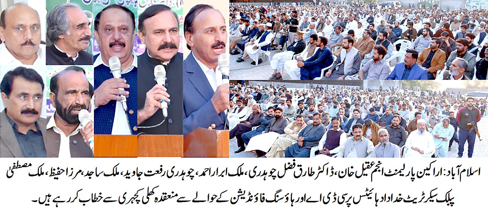 اسلام آباد (اردو ٹائمز) (سٹی رپورٹر)اسلام آبادکے اراکین پارلیمنٹ کی پبلک سیکرٹریٹ خداداد ہائیٹس پر سی ڈی اے اور ہاؤسنگ فاؤنڈیشن کے حوالے سے کھلی کچہری رکن قومی اسمبلی انجم عقیل خان ، ایم این اے چیف وہیپ ڈاکٹر طارق فضل چوہدری ، ایم این اے ملک ابرار احمد کی شرکت
