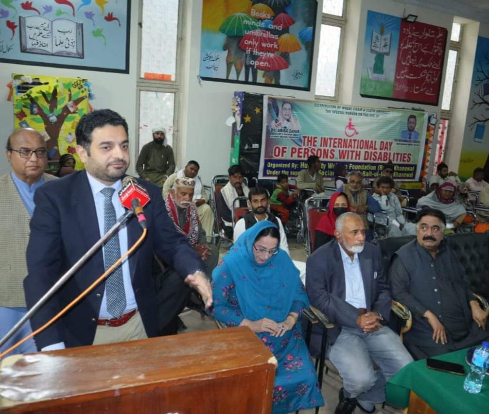 Khanewal (Saqib Khan Khattar) On the occasion of “International Day of Persons with Disabilities” organized by “Hamonti Welfare Foundation” Khanewal, a function was organized with special persons at Jinnah Library Hall, in which the chairperson of the foundation Dr. Abida Zafar Sahiba. “Wheelchairs” to 20 special persons and cloths to 100 special personswere distributed. Deputy Commissioner Muhammad Ali Bukhari distributed these gifts to special people.