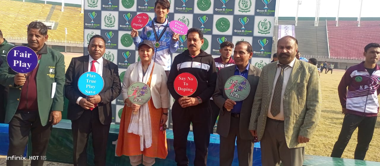 قائداعظم بین الصوبائی گیمز ایتھلیٹکس ایونٹس کی تقریب تقسیم انعامات کے موقع پر سابق ڈائریکٹر جنرل پاکستان سپورٹس بورڈ ڈاکٹر اختر نواز گنجیرا، اصغر علی مبارک، شاہد الحق اور دیگر آفیشلز میڈلز تقسیم کیے