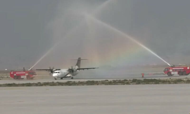 گوادر میں نئے انٹرنیشنل ایئرپورٹ کا باضابطہ افتتاح کردیا گیا ہے، قومی ایئرلائن کی پہلی پرواز ہوائی اڈے پر لینڈ کرگئی، طیارے کو واٹر کینن کی سلامی دی گئی۔