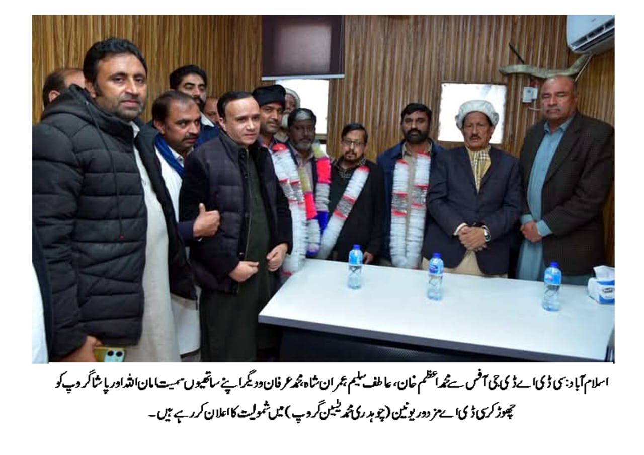 ڈی جی آفس سے محمد اعظم خان،عاطف سلیم،عمران شاہ،محمدعرفان و دیگراپنے ساتھیوں سمیت امان اللہ اور پاشاگروپ کو چھوڑ کر سی ڈی اے مزدور یونین (چوہدری محمد یٰسین گروپ) میں شامل۔