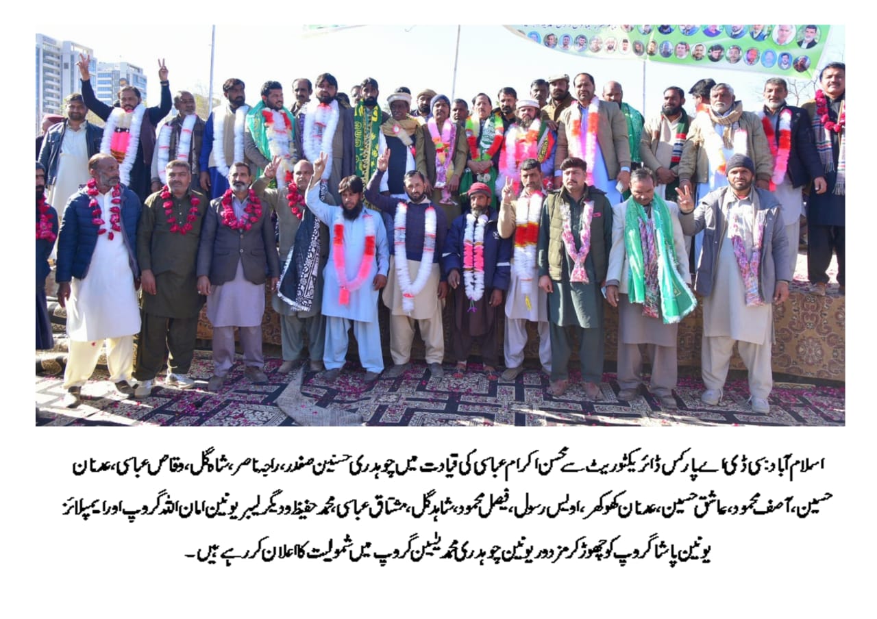 سی ڈی اے پارکس ڈائریکٹوریٹ کے جلسے میں محسن اکرام عباسی کی قیادت میں چوہدری حسنین صفدر،راجہ ناصر،شاہ گل،وقاص عباسی و دیگرسینکڑوں ملازمین مزدور یونین میں شامل۔