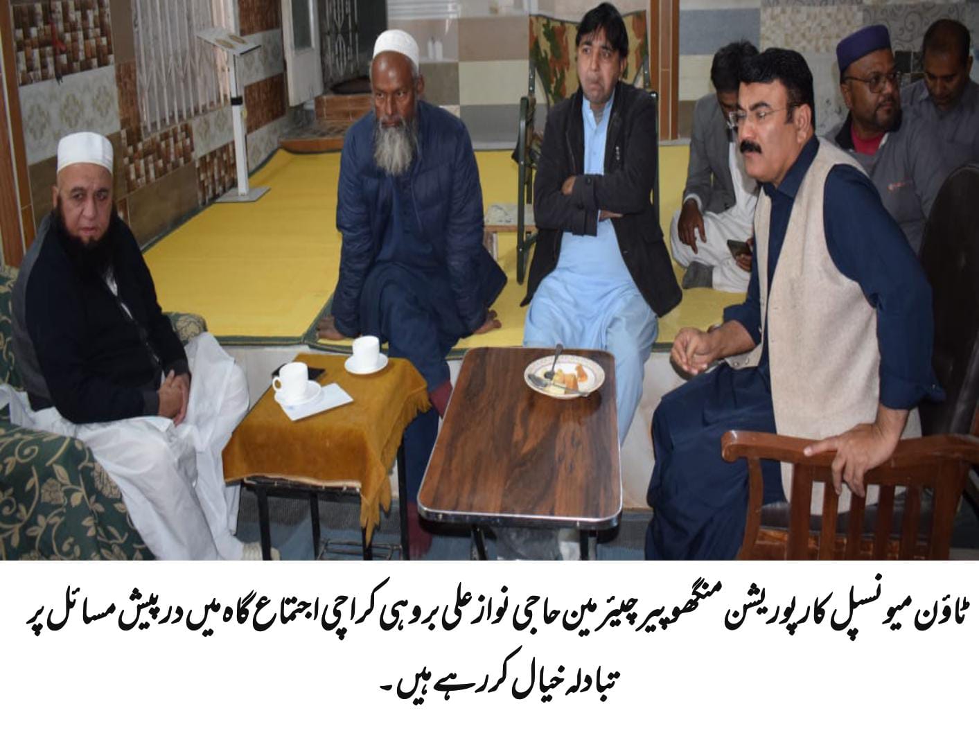 Karachi (Urdu Times)(Report pirbux Noonari)Karachi Haji Nawaz Ali Brohi, chairman of Town Municipal Corporation Mangho Peer, visited the meeting hall in Karachi, met Maulana Haji Abdul Wahab, who is responsible for administrative affairs, discussed the problems faced in the meeting hall and assured to solve all the problems. On this occasion, the officers and staff of the Solid Waste Management Board, the officers and staff of the Water Board and the officers and staff of other departments of the town were also present while talking to the media on this occasion, he said.