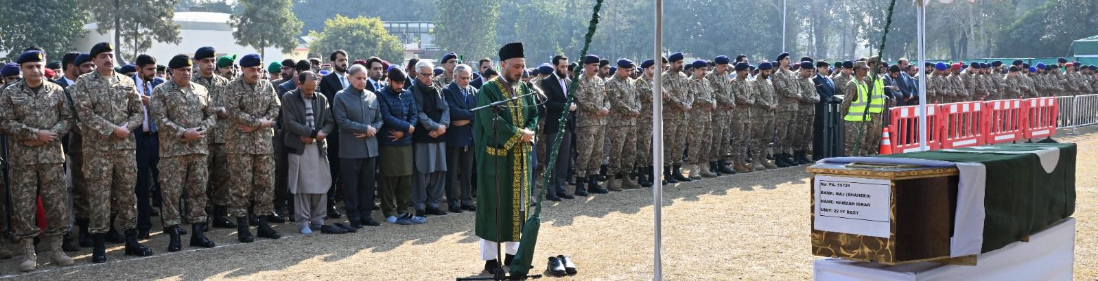 Rawalpindi (Urdu Times) The funeral prayer of Major Hamza Israr Shaheed (aged 29, resident of District Rawalpindi), who embraced martyrdom while valiantly defending the motherland in Mir Ali, was solemnly offered at Chaklala Garrison, Rawalpindi.