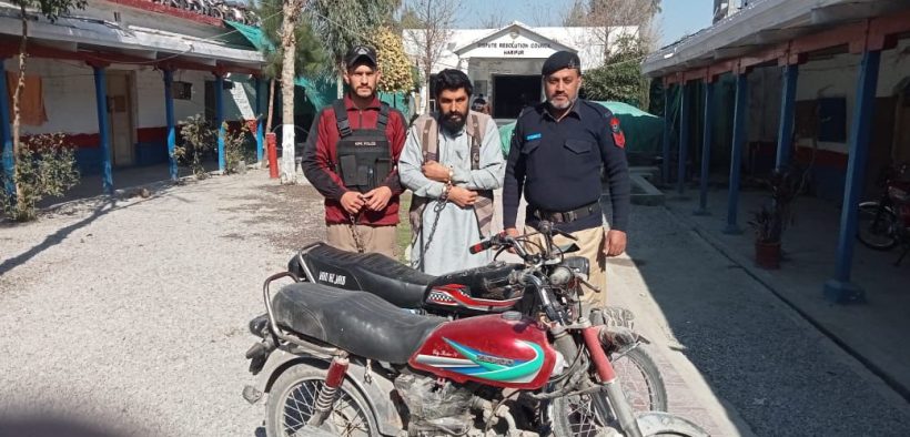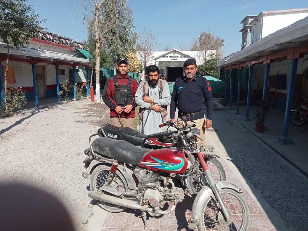 ایس ایچ او تھانہ سٹی اعجاز علی نے ہمراہ نفری پولیس کے کاروائی کرتے ہوئے علیم الدین الد دوست محمد سکنہ صوابی کو گرفتار کر کے قبضہ سے ٹرامہ سنٹر ہری پور سے چوری ہونے والے موٹرسائیکل سمیت مذید ایک موٹرسائیکل اور رقم مبلغ ڈھائی لاکھ روپے برآمد کرلیے ۔ ملزم علیم الدین عادی جرائم پیشہ ہے جو صوابی پولیس کو بھی متعدد مقدمات میں مطلوب ہے ۔ملزم سے مذید تفتیش جاری ہے۔
