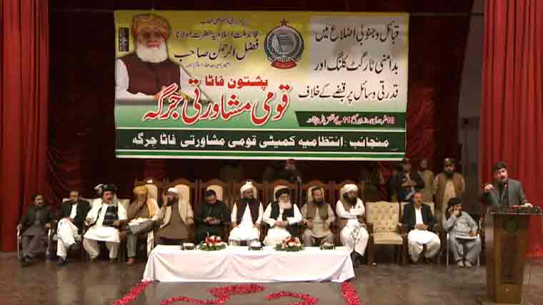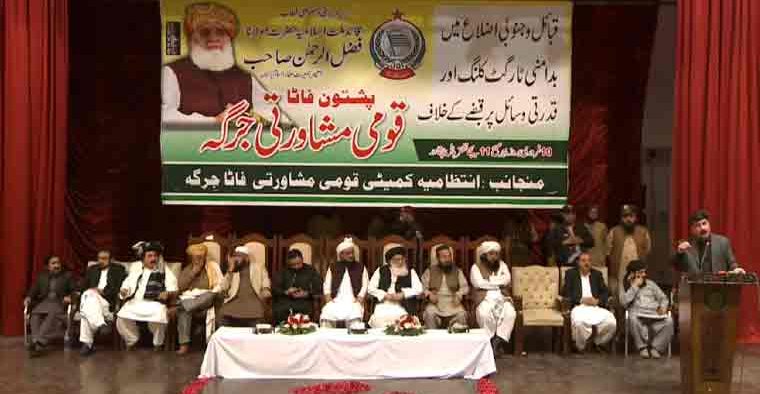 اعلامیہ کے مطابق پشتون قوم کے وسائل پر ان کا آئینی حق تسلیم کیا جائے اور وسائل پر مکمل اختیار دیا جائے، طویل جنگ میں جو جانی و مالی نقصان ہوا حکومت اس کا معاوضہ ادا کر کے نقصانات کا ازالہ کرے، درآمدات اور برآمد پر عائد کردہ 2 فیصد سیس ٹیکس واپس لیا جائے۔شرکا نے مطالبہ کیا کہ آئی ایم ایف کے مطالبہ پر لگائے گئے زرعی ٹیکس کو فی الفور واپس لیا جائے، مولانا فضل الرحمان تمام پشتون سیاسی قیادت کو اے پی سی میں مدعو کریں۔