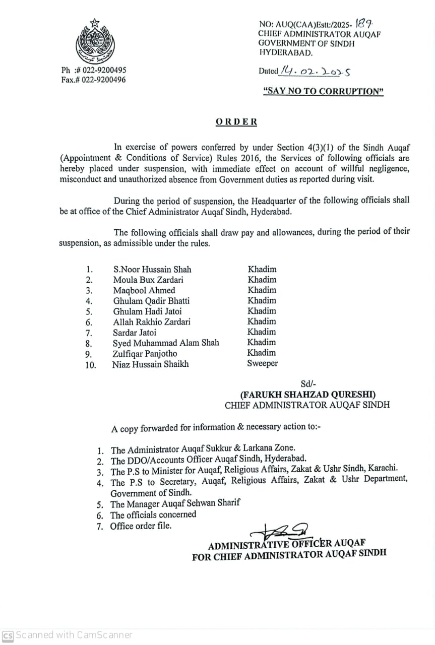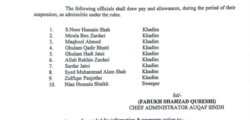 کراچی (اردو ٹائمز)( رپورٹ : پیر بخش نوناری ) کراچی محکمہ اوقاف نے 12 ملازمین کو معطل کر دیا سیکریٹری اوقاف سندھ مزار پر آئے زائرین سے لوٹ مار کی وڈیو میں نظر آنے والے محکمہ کے بارہ ملازمین کی معطلی کا نوٹیفیکیشن جاری۔