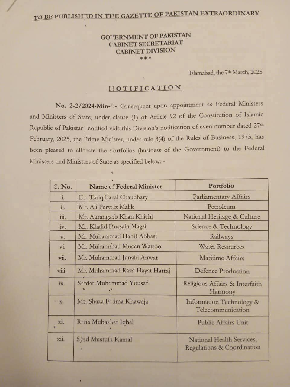 عبد الرحمٰن کانجو کو وزیرِ مملکت برائے پاور مقرر کردیا گیا اور وزیرِ مملکت برائے پبلک افئیرز یونٹ کا اضافی قلمدان سونپ دیا گیا۔