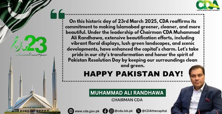 ISLAMABAD (Urdu Times) 23rd March 2025 – Pakistan Day 🇵🇰✨ Under the dynamic leadership of Muhammad Ali Randhawa, Chairman CDA & Chief Commissioner Islamabad