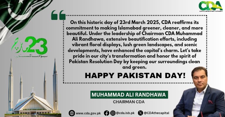 Under the dynamic leadership of Muhammad Ali Randhawa, Chairman CDA & Chief Commissioner Islamabad, CDA proudly joins the nation in commemorating this historic milestone.
