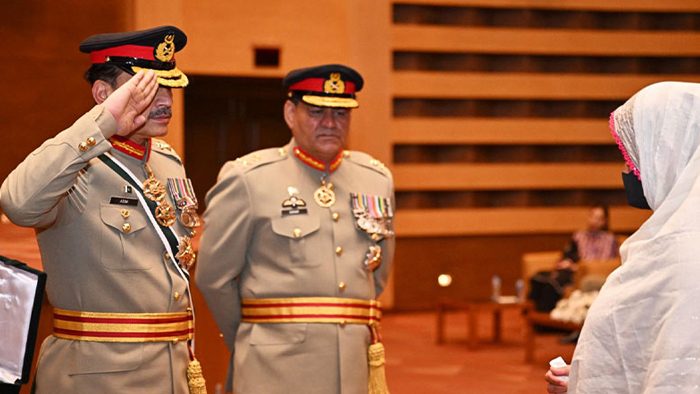 راولپنڈی (اردو ٹائمز)(آئی پی ایس) جنرل ہیڈکوارٹرز (جی ایچ کیو) راولپنڈی میں ایک پروقار اعزازی تقریب کا انعقاد کیا گیا، جہاں پاک فوج کے سپہ سالار جنرل سید عاصم منیر، نشانِ امتیاز (ملٹری) نے ملک و قوم کے لیے نمایاں خدمات اور جرات مندانہ کارکردگی کا مظاہرہ کرنے والے افسران اور جوانوں کو عسکری اعزازات سے نوازا۔