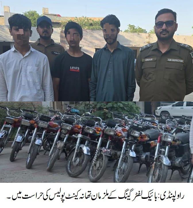 راولپنڈی (اردو ٹائمز) ایس ایچ او تھانہ کینٹ لقمان جاوید کی زیرنگرانی پولیس ٹیم کی کاروائی، 3 رکنی بائیک لفٹر گینگ گرفتار، 20 مسروقہ موٹر سائیکل برآمد،ملزمان مختلف علاقوں سے موٹر سائیکل چوری کرتے تھے۔ تفصیلات کے مطابق تھانہ کینٹ پولیس نے کاروائی کرتے ہوئے3 رکنی بائیک لفٹر گینگ کو گرفتار کرلیا،گرفتار ملزمان میں نظام، موسیٰ اور طیب شامل ہیں،ملزم سے 20 مسروقہ موٹر سائیکل برآمدہوئے، ملزمان مختلف علاقوں سے موٹر سائیکل چوری کرتے تھے، ایس پی پوٹھوہار طلحہ ولی کا کہنا تھاکہ ملزمان کو ٹھوس شواہد کے ساتھ چالان عدالت کیا جائے گا،شہریوں کی جان و مال پر حملہ کرنے والے افراد قانون کی گرفت سے نہیں بچ سکتے۔