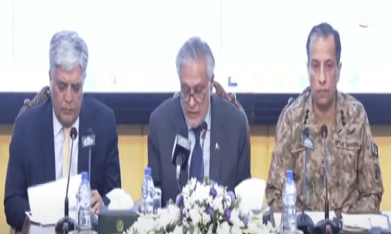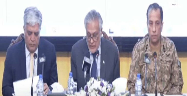 اسحق ڈار نے ڈائریکٹر جنرل (ڈی جی)انٹر سروسز پبلک ریلیشن (آئی ایس پی آر)لیفٹیننٹ جنرل احمد شریف چوہدری کے ہمراہ پریس کانفرنس کر رہے ہیں، ان کے ہمراہ ترجمان دفتر خارجہ شفقت علی خان بھی موجود ہیں۔