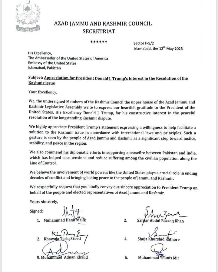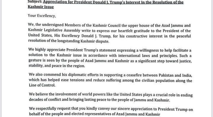 اسلام آباد ،آزاد جموں و کشمیر کونسل کے تمام منتخب ارکان نے پاک بھارت جنگ بندی اور مسئلہ کشمیر کے حل میں کردار ادا کرنے پر امریکی صدر ڈونلڈ ٹرمپ کا شکریہ ادا کرتے ہوئے ان کی کوششوں کو سراہا ہے