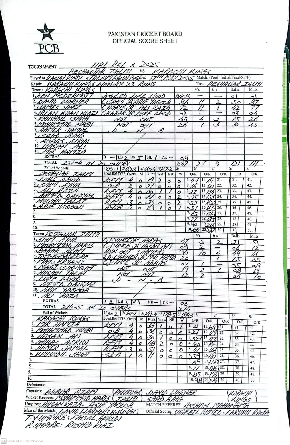 Rawalpindi (Urdu Times) PSL 10: Karachi Kings defeat Peshawar Zalmi by 23 runs