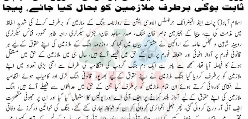 روزنامہ جنگ ملازمین کی برطرفی اداروں کی تباہی ثابت ہوگی برطرف ملازمین کو بحال کیا جائے، پیجا