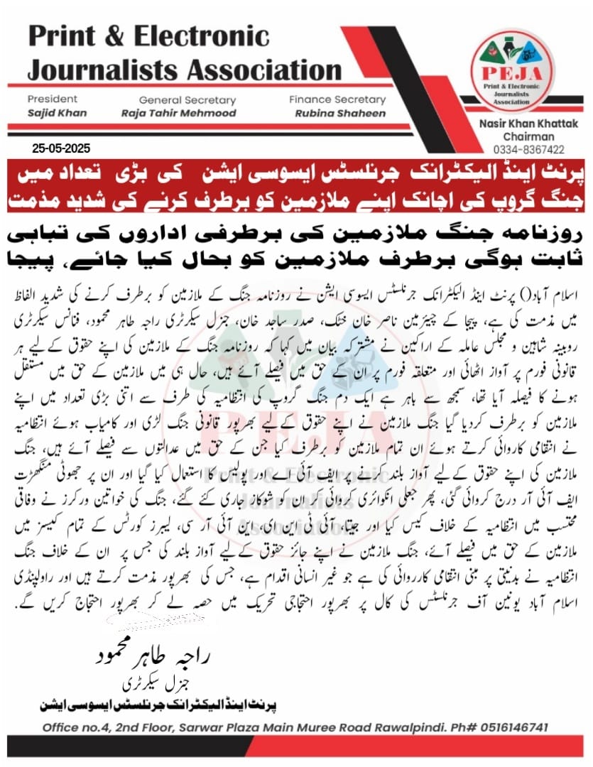 پرنٹ اینڈ الیکٹرانک جرنلسٹس ایسوسی ایشن کی بڑی تعداد میں جنگ گروپ کی اچانک اپنے ملازمین کو برطرف کرنے کی شدید مذمت