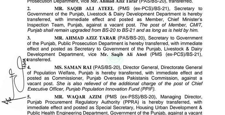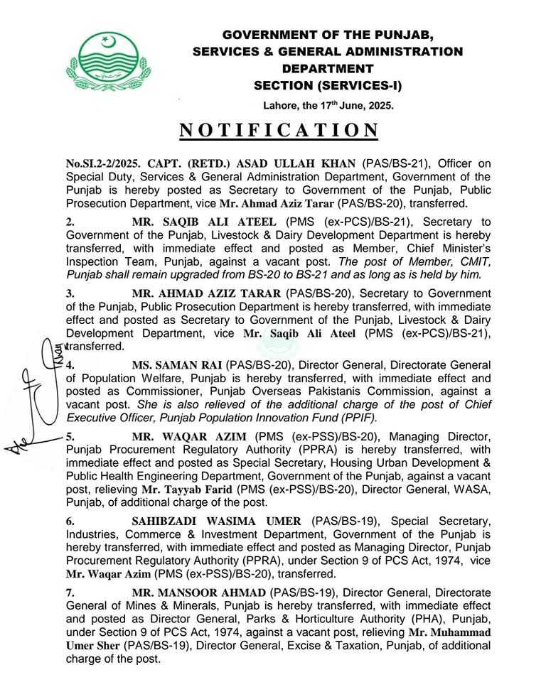 احمد عزیز تارڑ کو سیکرٹری محکمہ لائیو اسٹاک تعینات کردیا گیا