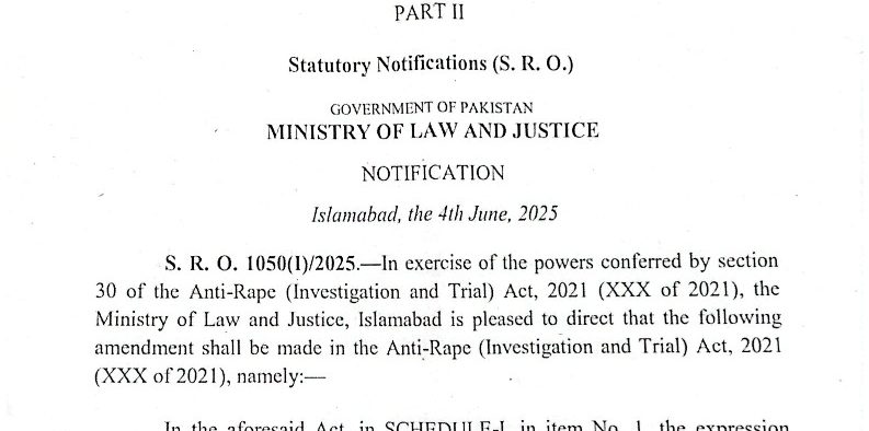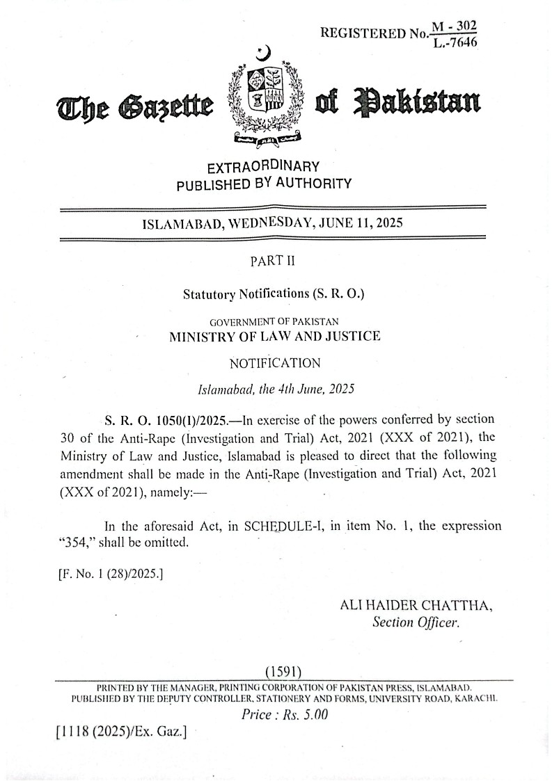اسلام آ باد، 17 جون 2025 (اردو ٹائمز)۔ وزارت قانون و انصاف نے خصوصی کمیٹی کی سفارش پر انسداد عصمت دری (تحقیقات اور ٹرائل) ایکٹ 2021 سے دفعہ 354 کو ہٹادیا