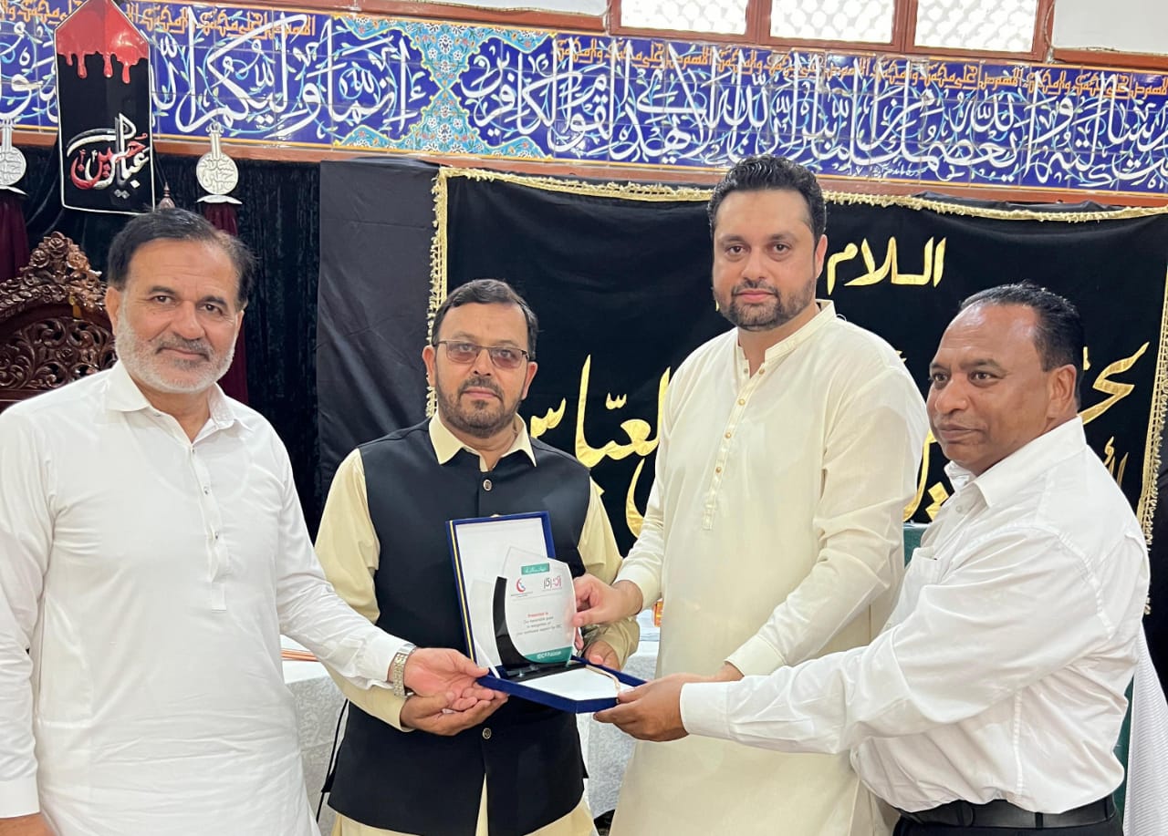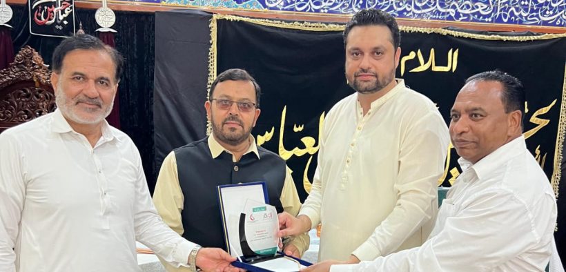 Islamabad (Urdu Times) Asghar Ali Mubarak, Fida Abbas Zaidi presenting shields to Ajmal Zaidi and others of Al-Qaim Lawyers Forum on the occasion of the 12th annual foundation day of Imamia Disaster Management Cell.