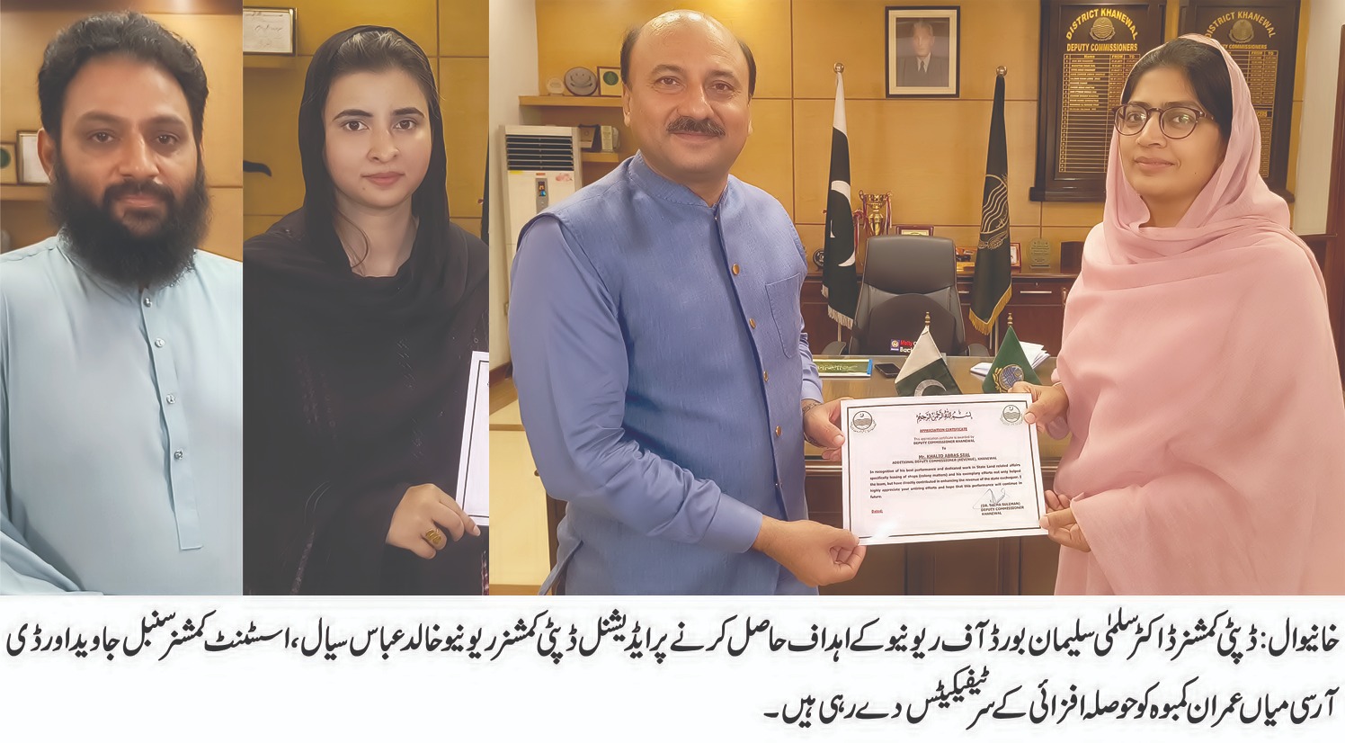 ISLAMABAD (Urdu Times): The Punjab Government has appreciated the outstanding performance of Additional Deputy Commissioner Revenue Khanewal Khalid Abbas Sial and his team for leasing government land, leasing of shops and occupying mafia from the Board of Revenue of Punjab, on this matter. Dr. Salmi Suleiman has given Additional Deputy Commissioner Revenue Khalid Abbas Sial, Assistant Commissioner Sanbal Javed and DRC Mian Imran Kamboh on the best performance of the Government of Punjab (approved). The government has sincerely fulfilled the duties of Punjab by following the orders of Punjab. He said that at the behest of the Board of Revenue, 307 acres of various Chakok land worth 1745 million agricultural land and 920 million government shops have been investigated in Khanewal district. In a good way, the authority will be ensured in a good way.