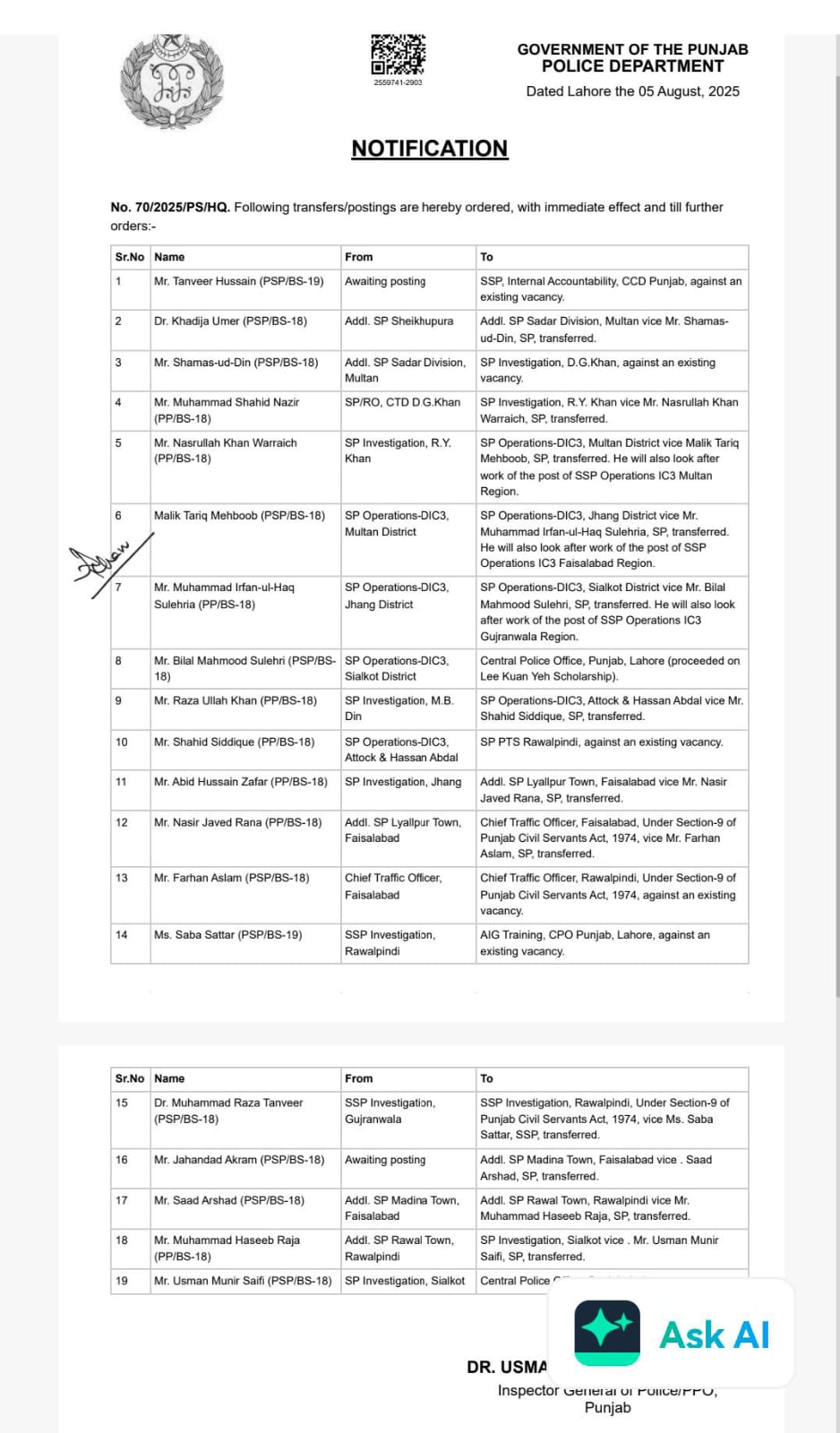 ایس پی راول محمد حسیب راجہ تبدیل، ایس پی سعد ارشد فیصل آباد سے تبدیل کرتے ہوئے ایس پی راول ٹاون راولپنڈی تعینات کردیا گیا