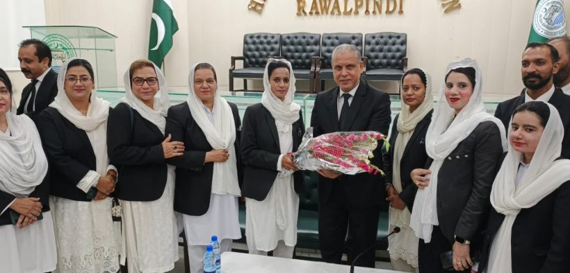 Rawalpindi (Urdu Times) Member Executive Lahore High Court Bar Association, Advocate Miss Tahira Bano Mubarak, Advocate Miss Uzma Mubarak, Advocate Azmat Ali Mubarak, former member executive and others presented a bouquet of flowers to Mr. Justice Sadaqat Ali Khan during a ceremony in Rawalpindi,
