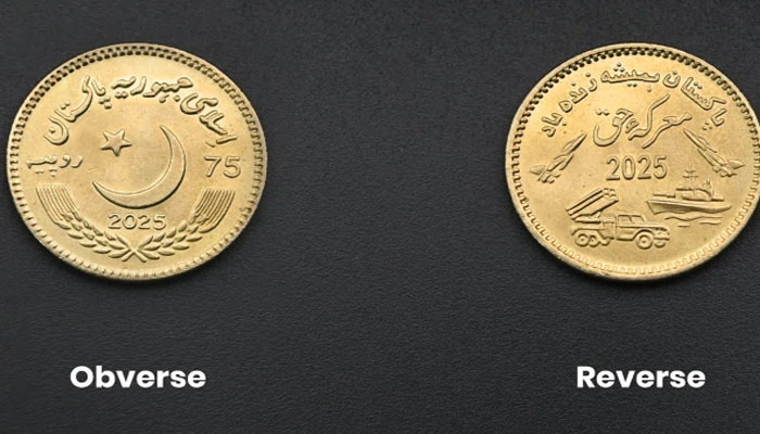 سکے کے بالائی کناروں پر اردو میں پاکستان ہمیشہ زندہ باد رقم ہے، سکے کے پچھلے رخ پر (دائیں اور بائیں جانب)دو لڑاکا طیارے، بحری جہاز، ملٹی پل راکٹ لانچر سسٹم ابھرے ہوئے دکھائی دیتے ہیں۔ مذکورہ سکہ اسٹیٹ بینک بینکنگ سروسز کارپوریشن کے فیلڈ دفاتر کے ایکسچینج کاونٹرز پر 15 اگست 2025 سے دستیاب ہے۔