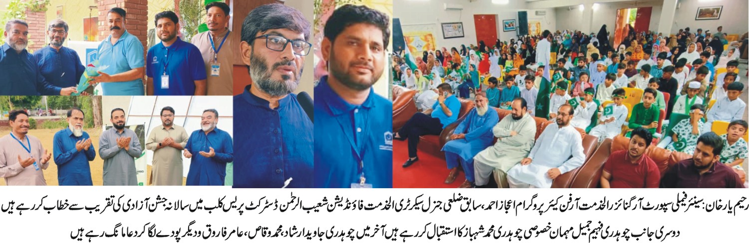 رحیم یارخان (اردو ٹائمز) الخدمت فاؤنڈیشن ضلع رحیم یارخان کے زیراہتمام آرفن کیئر پروگرام کی سالانہ جشنِ آزادی کی تقریب ڈسٹرکٹ پریس کلب رحیم یارخان کے آڈیٹوریم میں منعقد ہوئی