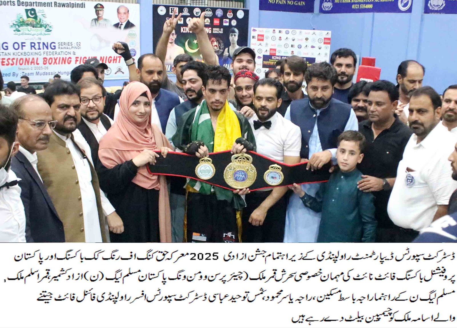 According to the details, the Independence Day 2025 Meerkat Haq King of the Ring Kickboxing and Pakistan Professional Boxing Fight Night Event organized by the District Sports Department Rawalpindi was held at the Shahbaz Sharif Sports Complex, with the special guest of the closing ceremony Ms. Sehrish Qamar Malik was the Chairperson of the Women Wing of Pakistan Muslim League (N) Azad Kashmir. She was accompanied by Qamar Aslam Malik, PML-N leaders Raja Basit Miskin, Raja Yasir Mahmood PS II, Brister Daniyal Chaudhry MNA Sardar Tahir, Sardar Naeem, Malik Raees Awan, Malik Naveed Sadiq, Malik Asim and Bahawalpur Express President Saddam Abbasi. The special guest Sehrish Qamar Malik distributed medals among the players and shields among the officials. He congratulated the District Sports Department Rawalpindi for organizing a wonderful event. On this occasion, the Chairman Organizing Committee Shams Tohid Abbasi, District Sports Officer Rawalpindi, Organizing Secretary Mudassar Bashir Malik Muhammad Sajid Awan also congratulated them for organizing a beautiful event.