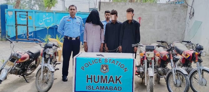 ملزمان (1)مححمد رمضان ولد ابراہیم ساکن رابی سنٹر بحریہ ٹاون فیز 7راولپنڈی(2)علی حسن ولد محمد الیاس ساکن ساکن عائشہ ٹاون اسلام آباد(3)محمد عثمان ولد ذوالفقار اسکن سواں کیمپ اسلام آباد کو گرفتار کرکے ملزمان کے قبضہ سے دوران واردات استعمال ہونے والا اسلحہ اور دوران واردات چوری شدہ 05عدد مسروقہ موٹربرآمد موٹرسائیکل برآمد مزید تفتیش کرنے پر ملزمان نے تھانہ ہذا کے مقدمات نمبری 711/25۔791/25-801/25-744/25-بجرم 381Aاور مقدمہ نمبر 736/25بجرم 382ت پ تھانہ ہمک کی وارداتوں کا انکشاف کیا ہے مزید تفتیش جاری ہے