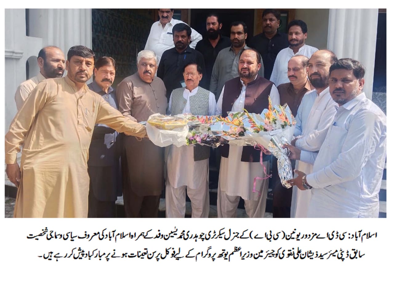 سی ڈی اے مزدور یونین کا سید ذیشان علی نقوی کو چیئرمین وزیر اعظم یوتھ پروگرام کے لیے فوکل پرسن تعینات ہونے پر مبارکباد۔