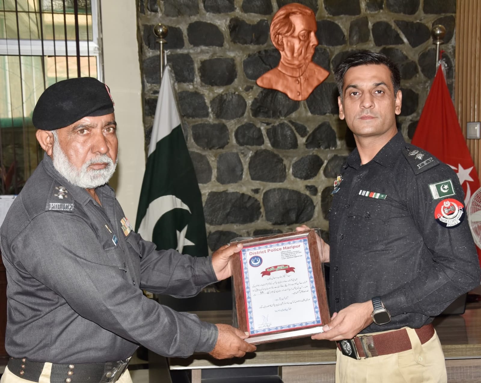 محکمہ پولیس ضلع ہری پور میں اپنی مدت ملازمت پوری کرنے والےانسپکٹر لیاقت خان اور سب انسپکٹر وصال خان کے اعزاز میں ڈی پی او آفس میں تقریب کا انعقاد کیا گیا ۔ تقریب میں ڈی پی او ہری پور فرحان خان اور دیگر سٹاف نے شرکت کی ۔ڈی پی او ہری پور نے محکمہ پولیس کیلئے خدمات سراہا اور کہا کہ آپ ہمیشہ محکمہ پولیس کا حصہ رہیں گئیں۔ اسی طرح آپ کے کیلئے ہمارے دروزاے ہمیشہ کھولے رہیں گئے۔ ریٹائرڈ ہونے والے والےانسپکٹر لیاقت خان اور سب انسپکٹر وصال خان کو ڈی پی او ہری پور نے ہری پور پولیس کی جانب سے یادگاری شیلڈز دی اور نیک خواہشات کا اظہار کیا۔