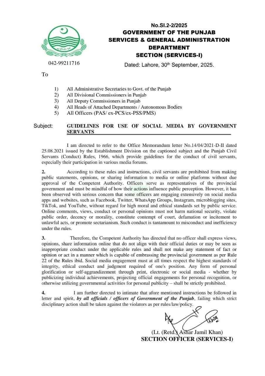 سول سرونٹس کو سوشل میڈیا پر بیانات، رائے یا معلومات شیئر کرنے کے لئے محتاط رہنے کی بھی ہدایت کردی