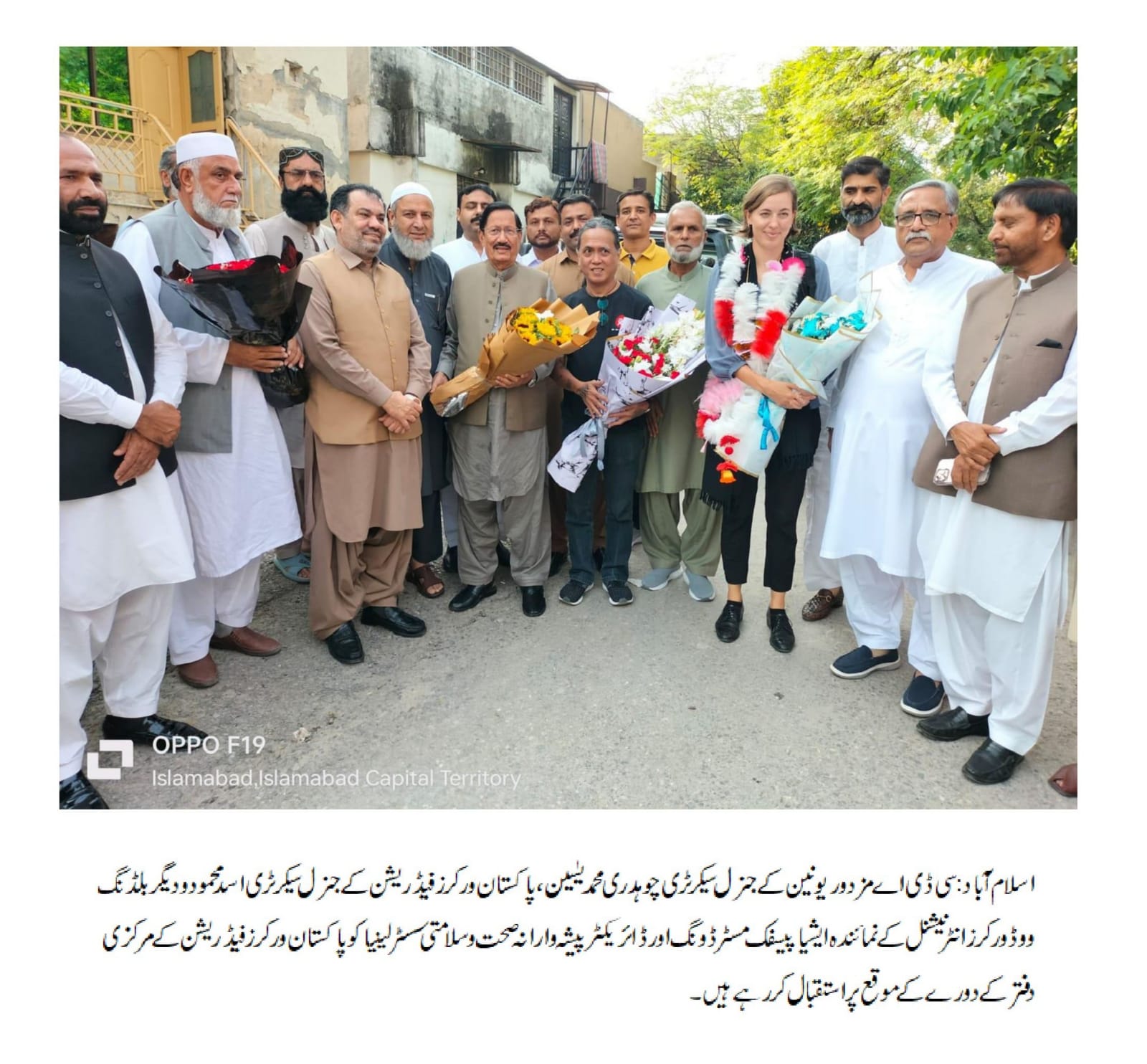 اسلام آباد (اردو ٹائمز) بلڈنگ ووڈ ورکرز انٹرنیشنل کے نمائندہ ایشیا پیسفک مسٹر ڈونگ اور ڈائریکٹر پیشہ وارانہ صحت و سلامتی سسٹر لینیا نے پاکستان ورکرز فیڈریشن کے مرکزی دفتر کا دورہ کیا، اس موقع پر انھوں نے قائد مزدور سی ڈی اے مزدور یونین کے جنرل سیکرٹری چوہدری محمد یٰسین، پاکستان ورکرز فیڈریشن کے جنرل سیکرٹری اسد محمود، صدر شوکت علی انجم، چیئرمین مین عبدالرحمن عاصی، وائس چیئرمین اشتیاق ورک، حاجی انور کمال، حاجی عبدالکریم، شاہد محمود، چوہدری محمد بلال، سید اعجاز بخاری، زاہد بھٹو، صفدر نفیس، محن ضیاء، حاجی صابر، سردار نسیم، وارث دلیپ، راجہ رحیم، شہناز بی بی سمیت پاکستان ورکرز فیڈریشن اور سی ڈی اے مزدور یونین کی قیادت کے ساتھ ملاقات کی۔