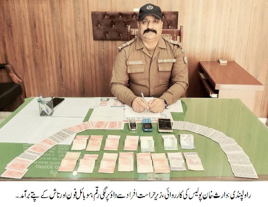 راولپنڈی (اردو ٹائمز) ایس ایچ او وارث خان کی زیرنگرانی شہزاد شاہ سب انسپکٹر کی ہمراہ پولیس ٹیم کارروائی، تاش کے پتوں پر جواء کھیلنے والے 8افراد گرفتار، داؤ پر لگی رقم 3 ہزار 100 روپے،3 موبائل فونز اور تاش کے پتے برآمد۔تفصیلات کے مطابق ایس ایچ او وارث خان خضر حیات کی زیرنگرانی پولیس ٹیم نے کارروائی کرتے ہوئے تاش کے پتوں پر جواء کھیلنے والے 8افراد کو گرفتار کرلیا،زیر حراست افراد سے داؤ پر لگی رقم 3 ہزار 100 روپے،3 موبائل فونز اور تاش کے پتے برآمدہوئے،ایس پی راول سعد ارشد کاکہنا تھا کہ زیر حراست افراد کو ٹھوس شواہد کے ساتھ چالان کیا جائے گا، قمار بازی دیگر معاشرتی برائیوں کی جڑ ہے۔