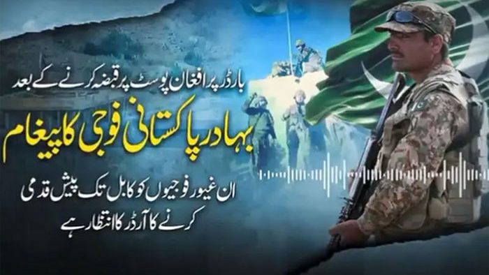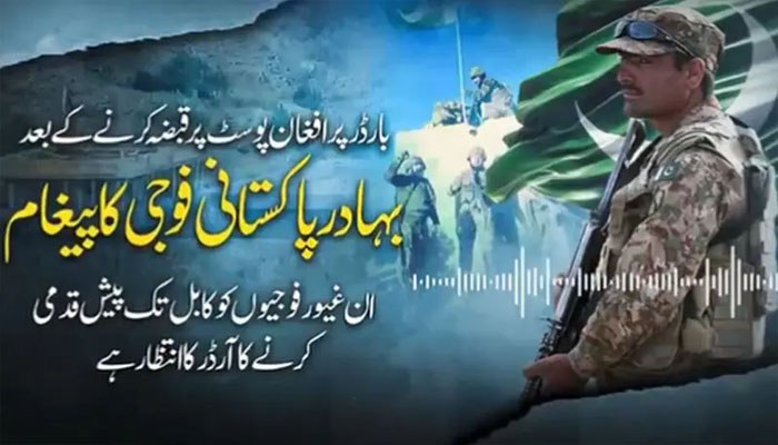 وائرل آڈیو پیغام میں فوجی جوان نے پیغام دیا کہ الحمد اللہ ہم نے افغان طالبان کا غرور خاک میں ملا دیا ہے اور فتنہ الہندوستان کے سارے دہشت گرد یہاں سے بھاگ گئے ہیں۔فوجی جوان نے کہا کہ ہم نے قبضہ کی گئی چوکیوں پر پاکستانی پرچم لہرا دیئے ہیں، وطن کی مٹی کی حفاظت کے لیے پاک فوج کے جوان مستعد اور چوکس ہیں۔آخر میں فوجی جوان اپنے کمانڈر سے آگے کی حکمت عملی طے کرنے کی اجازت طلب کرتا ہے کہ سر آگے کیا کرنا ہے۔ترجمان پاک فوج کا کہنا تھا کہ جوابی کارروائیوں میں 200 سے زائد افغان طالبان اور خارجی ہلاک کر دیے گئے، فائرنگ کے تبادلے میں پاک فوج کے 23 سپوت شہید اور 29 زخمی ہوئے جب کہ افغانستان کی 21 پوسٹوں پر بھی قبضہ کرلیا ہے۔