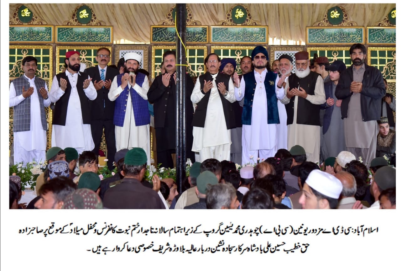 سی ڈی اے مزدور یونین (سی بی اے)چوہدری محمد یٰسین گروپ کے زیر اہتمام سالانہ تاجدار ختم نبوت کانفرنس و محفل میلاد ؐزیر صدارت صاحبزادہ حق خطیب حسین علی بادشاہ سرکار سجادہ نشین دربار عالیہ بلاوڑہ شریف سی ڈی اے چیئرمین آفس کمپلیکس سیکٹرG-7/4اسلام آباد میں منعقد ہوئی،کانفرنس میں وفاقی وزیر برائے مذہبی امورسردارمحمد یوسف،سابق ڈپٹی میئراعظم خان،اسلام آباد چیمبرآف کامرس کے سابق صدرظفربختاوری،نائب صدرخالد چوہدری،ایف پی سی سی آئی کے سابق صدر عبدالرؤف عالم،ساجد عباسی،معروف مذہبی وسماجی شخصیت الحاج محمدنوازگوندل،