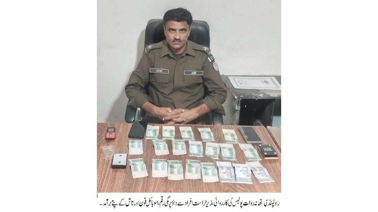 راولپنڈی (اردو ٹائمز)(مظہر شاہ)ایس ایچ او تھانہ روات زاہد ظہور کی سربراہی میں پولیس ٹیم کی کارروائی، تاش کے پتوں پر جواء کھیلنے والے 3 افراد گرفتار،داؤ پر لگی رقم 11 ہزار 500 روپے،3 موبائل فون اور تاش کے پتے برآمد۔تفصیلات کے مطابق تھانہ روات پولیس نے کارروائی کرتے ہوئے تاش کے پتوں پر جواء کھیلنے والے 3 افراد کو گرفتار کرلیا،داؤ پر لگی رقم 11 ہزار 500 روپے،3 موبائل فون اور تاش کے پتے برآمدہوئے،روات پولیس نے مقدمہ درج کرکے گرفتار کرلیا،ایس پی صدر انعم شیر کاکہنا تھا کہ قمار بازی دیگر معاشرتی برائیوں کی جڑ ہے۔